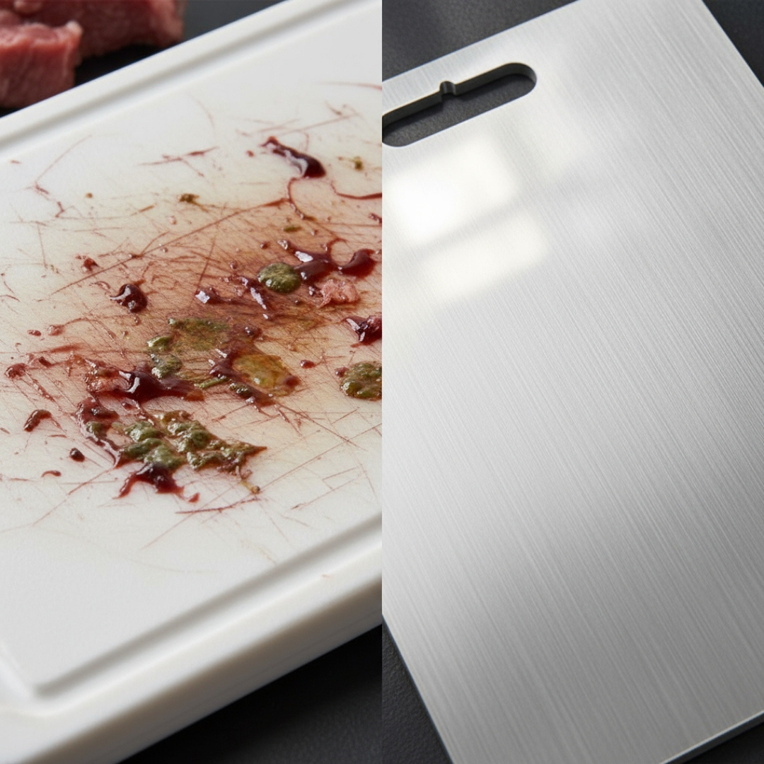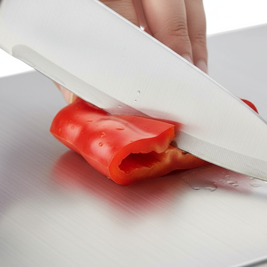 קרשי חיתוך מפלסטיק ועץ הם מצע מושלם לבקטריות. החומר שלהם סופג נוזלים, ריחות ושאריות מזון שחודרות לעומק החומר ויוצרות מושבות חיידקים שלא ניתן לנקות באמת - גם אם שוטפים חזק. החריצים שנוצרים מסכינים הופכים לפסי לכלוך קבועים שמזהמים כל ירק או פרי שעובר עליהם. בפועל, כל חיתוך מחדש מערבב אוכל טרי עם חיידקים ישנים - וזה מסכן אותך ואת המשפחה שלך בלי שתראה את זה בעין. קרש הטיטניום שלנו פותר את כל זה: הוא לא סופג כלום, לא מקבל ריחות, לא נשרט, ולא מאפשר לחיידקים להיתפס. המשטח נשאר 100% סטרילי, יבש ונקי גם אחרי שנים של שימוש - וזה מה שהופך אותו לקרש הבטוח ביותר להכנת אוכל בבית.